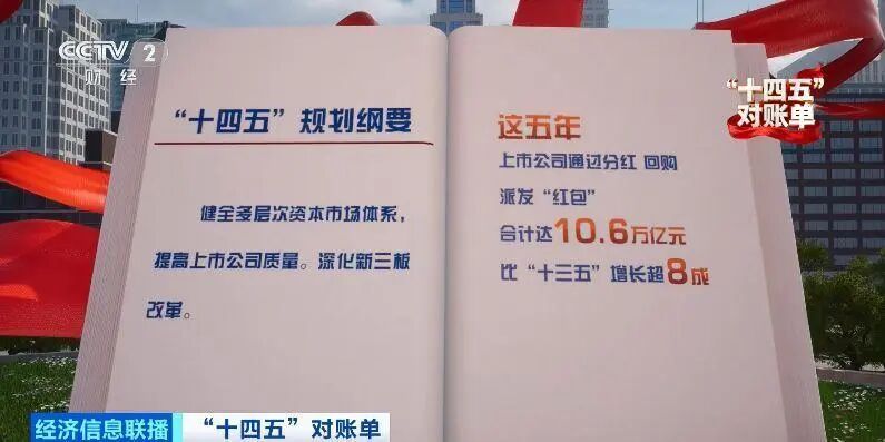 “十四五”规划纲要提出,健全多层次资本市场体系,提高上市公司质量。深化新三板改革。今年8月,A股市场总市值首次突破100万亿元。这5年,上市公司通过分红、回购派发“红包”合计达到10.6万亿元,比“十三五”增长超过八成。