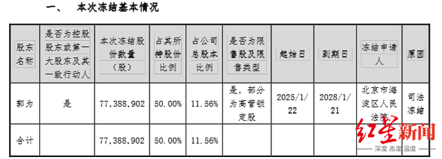 今年1月27日公司曾披露,因郭为婚姻家庭纠纷案件,其所持有的7738.89万股公司股份此前被北京市海淀区人民法院司法冻结,若冻结股份后续被处置,存在公司控股股东发生变更的风险。